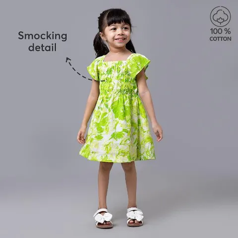 Look at this sweet ruffle-sleeve dress in vibrant green-and-white floral print, perfect for warm-weather adventures and special occasions.